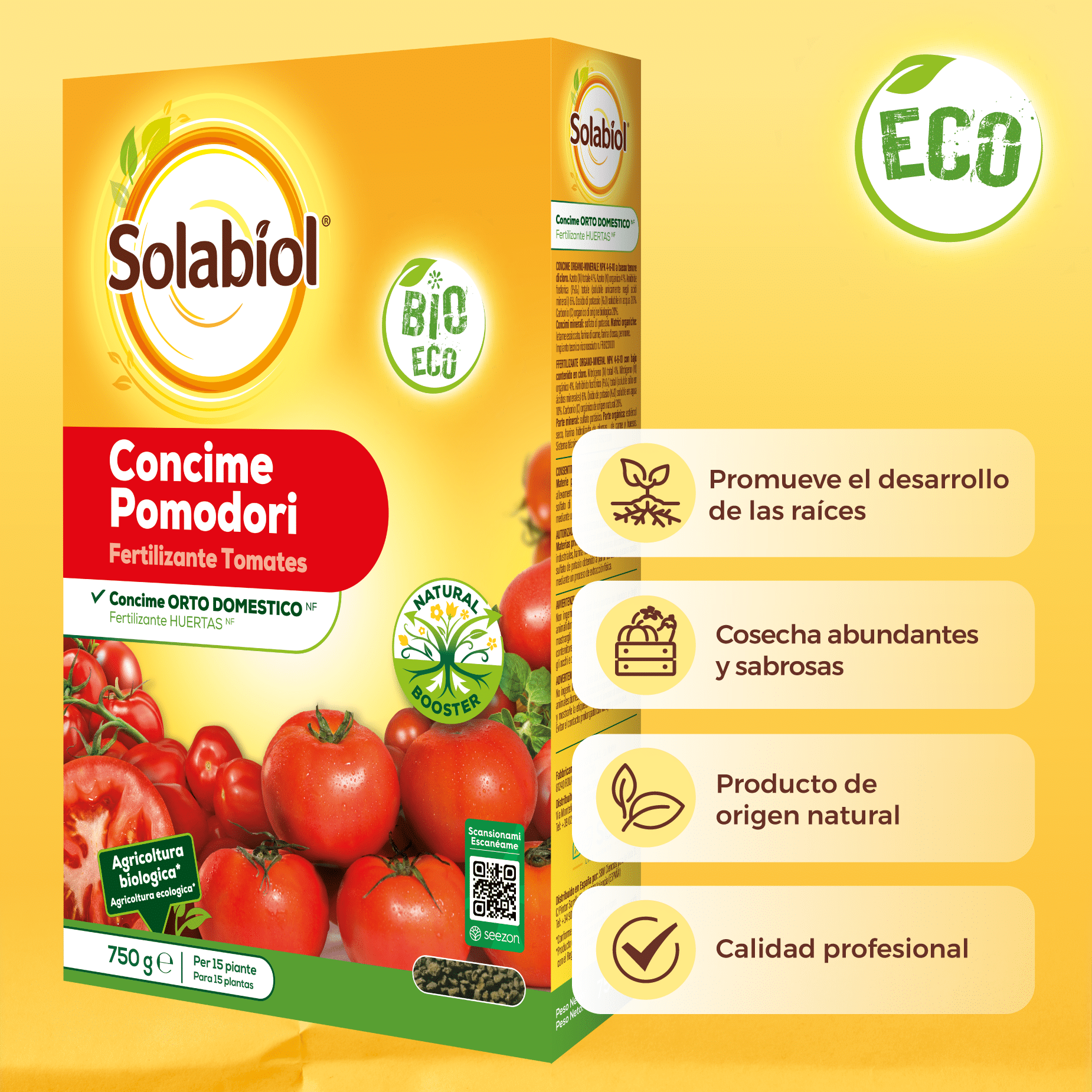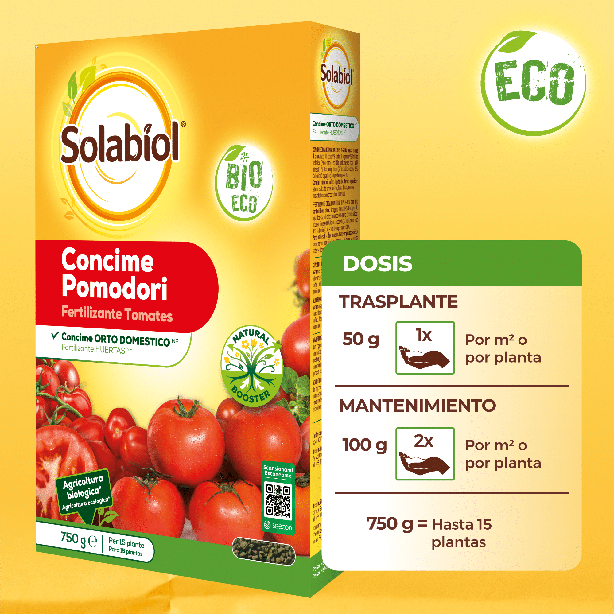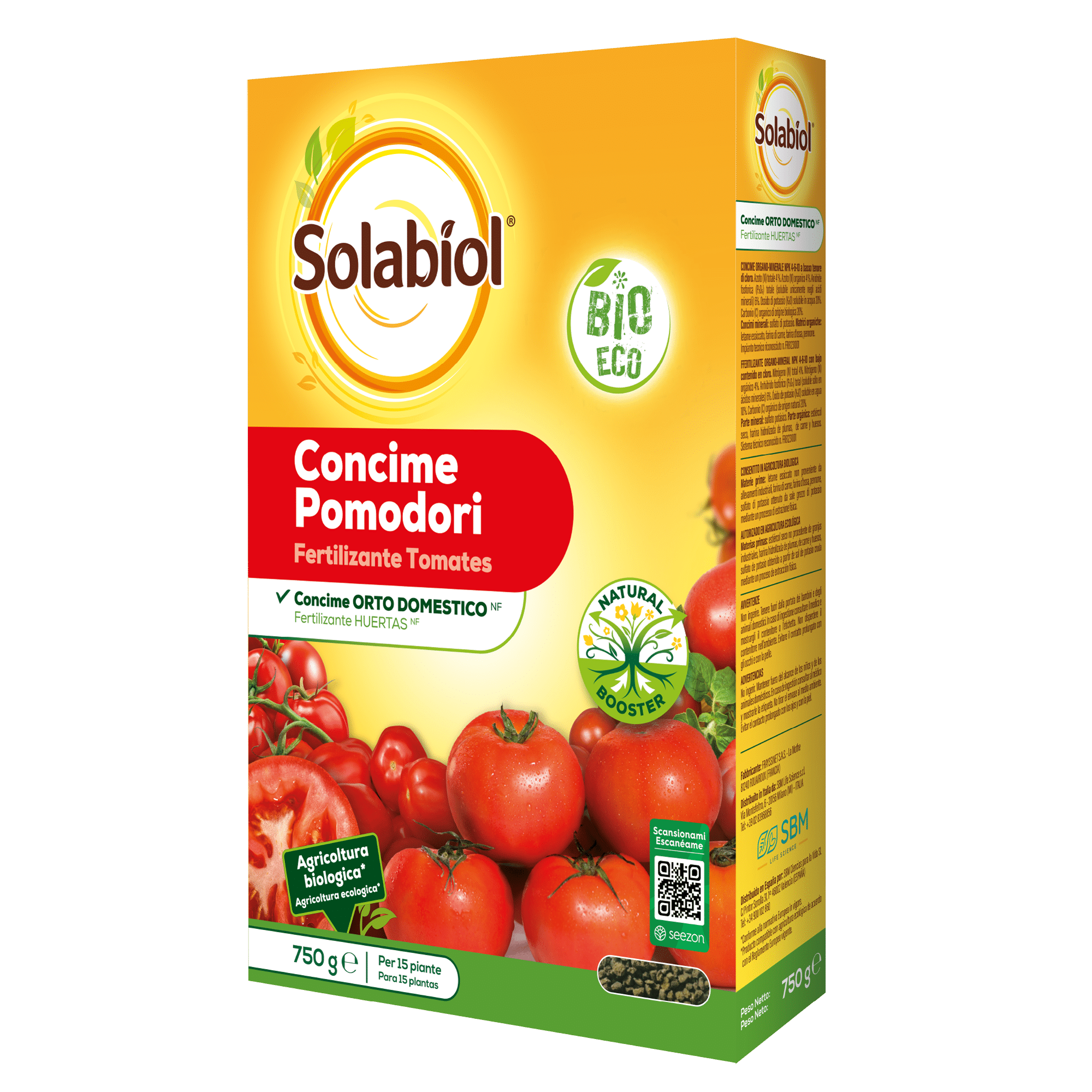 Solabiol Tomates es un abono granulado 100% natural con tecnología Natural Booster, que estimula el desarrollo radical y favorece el crecimiento de plantas sanas y exuberantes.