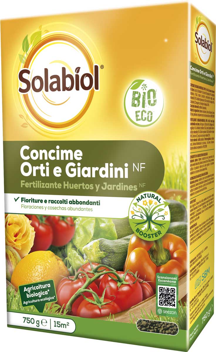 Fertilizante (NPK 4-6-10) 100% natural rico en potasio, esencial para el desarrollo de frutos y hortalizas. Con estimulador radicular Natural Booster que mejora la calidad de la cosecha y aumenta su rendimiento.