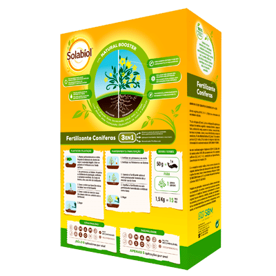 Solabiol Coniferas es un fertilizante 100% natural mejorado con estimulador radicular Natural Booster, diseñado para un aporte regular al suelo de los elementos nutrientes necesarios para un correcto desarrollo de árboles, arbustos o alineaciones de coníferas (cipreses, thujas, abetos, cedros…).