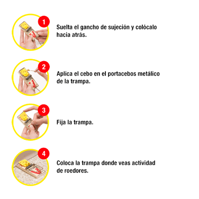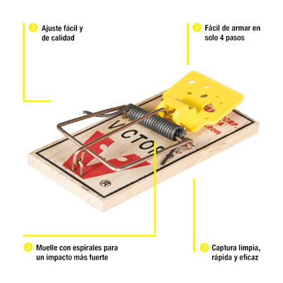Está equipadas con un pedal de plástico en forma de queso que favorece la atracción, mientras que la presencia de más resortes asegura una mayor potencia de cierre. La estructura de madera de pino hace que la trampa sea resistente a los golpes e ideal para su uso en entornos domésticos.