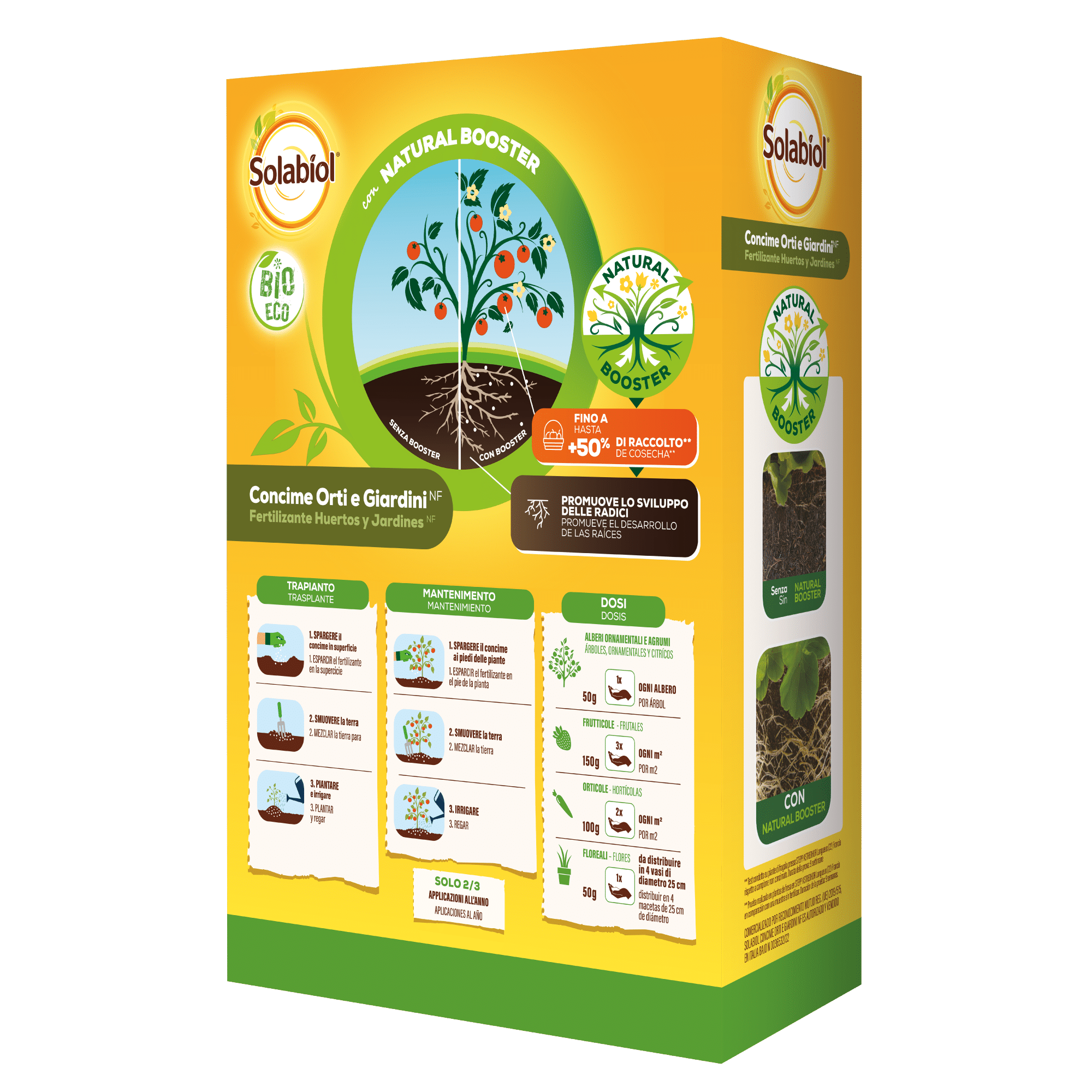 Solabiol Orti e Giardini es un abono granular 100% natural con la exclusiva tecnología Natural Booster. Favorece el desarrollo del aparato radicular, estimulando el crecimiento de plantas sanas y exuberantes. Gracias a este abono, las plantas se vuelven más resistentes al ataque de insectos y plagas.