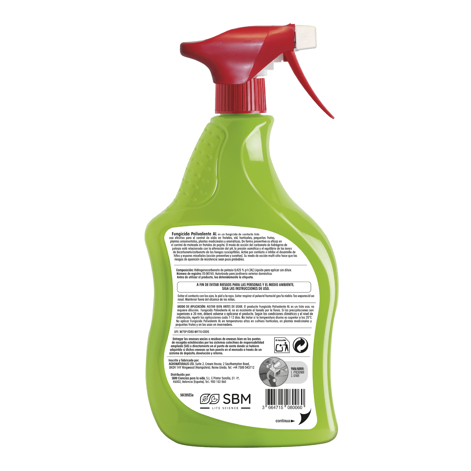 El fungicida polivalente AL es un fungicida de contacto listo uso a base de hidrogenocarbonato de potasio en cristales solubles con actividad preventiva y curativa contra las principales enfermedades fungicas como la Monilia y el oídio.