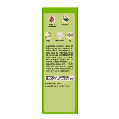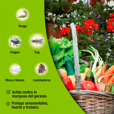 - Eficaz contra orugas, lepidopteros, mosca blanca, pulgones, trips