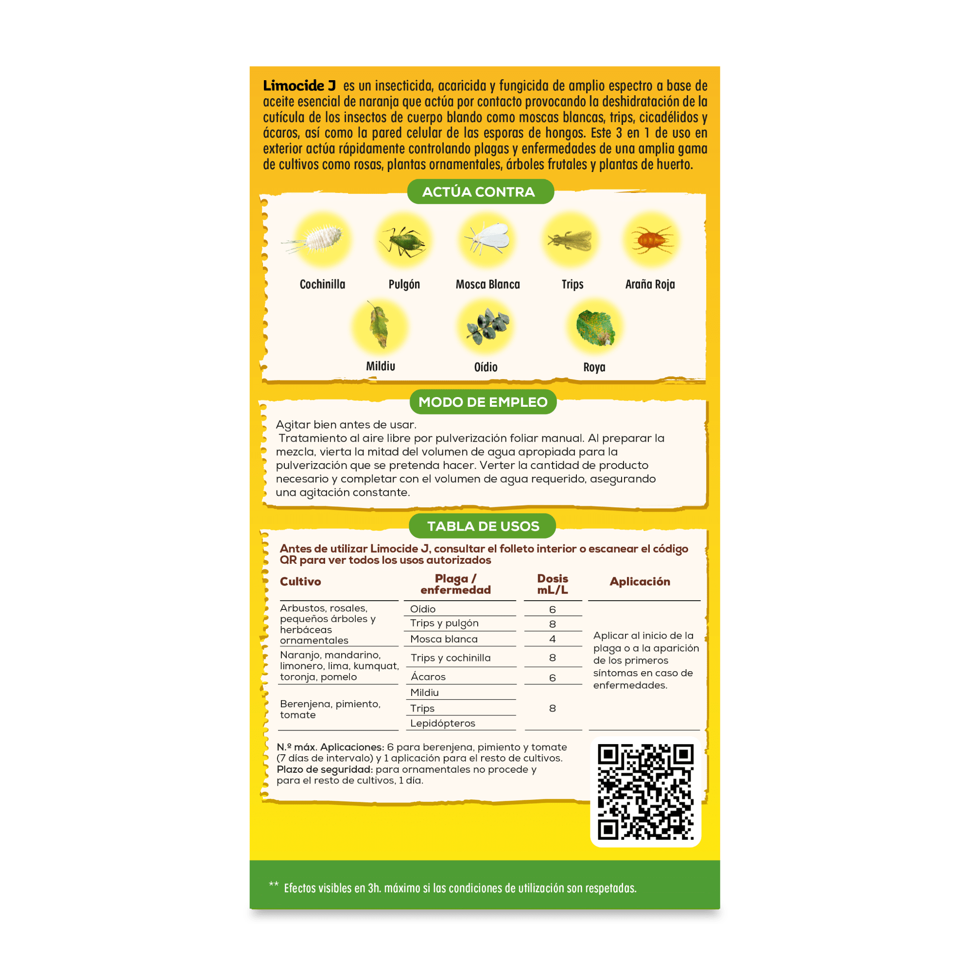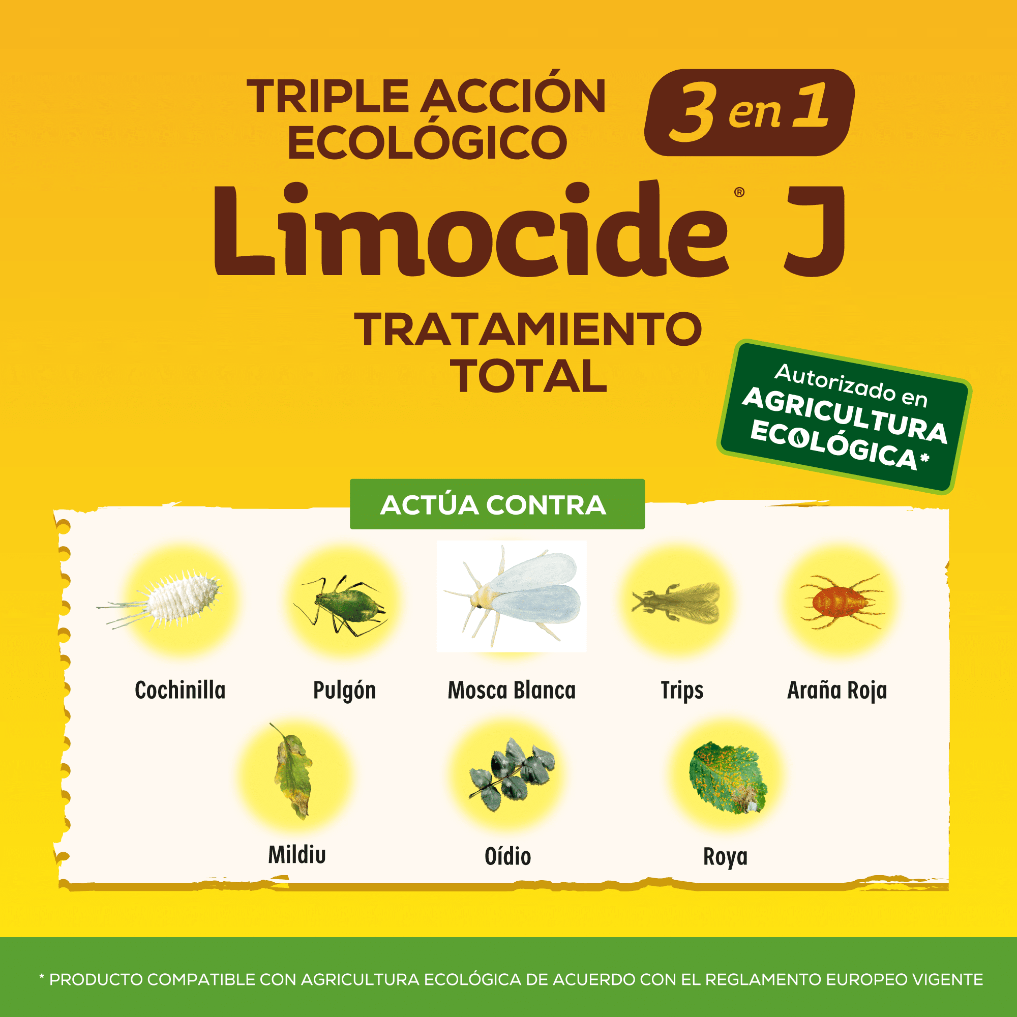 Limocide es un insecticida, acaricida y fungicida de amplio espectro a base de aceite esencial de naranja que actúa por contacto provocando la deshidratación de la cutícula de los insectos de cuerpo blando como moscas blancas, trips, cicadélidos y ácaros, así como la pared celular de las esporas de hongos.