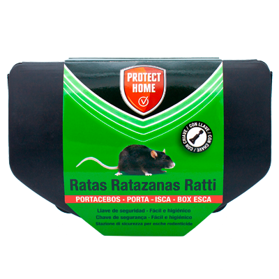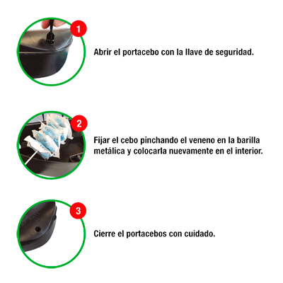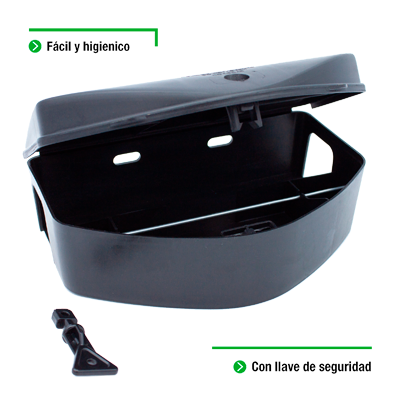 Fácil e higiénico. Diseño que permite solamente al roedor acceder al raticida. La fijación segura del cebo previene el arrastre del veneno fuera del portacebos evitando envenenamientos accidentales.