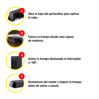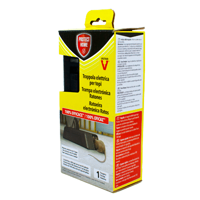 La trampa eléctrica para ratones y ratas deratización resolutiva. Para utilizarla basta con insertar el cebo atractivo y pulsar el botón de encendido. El ratón atraído por el cebo entra en la trampa, cierra el circuito caminando sobre las placas metálicas y recibe una descarga eléctrica mortal.