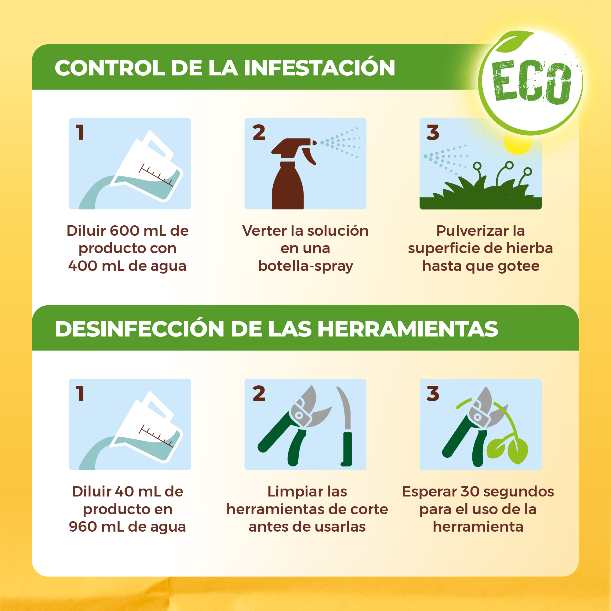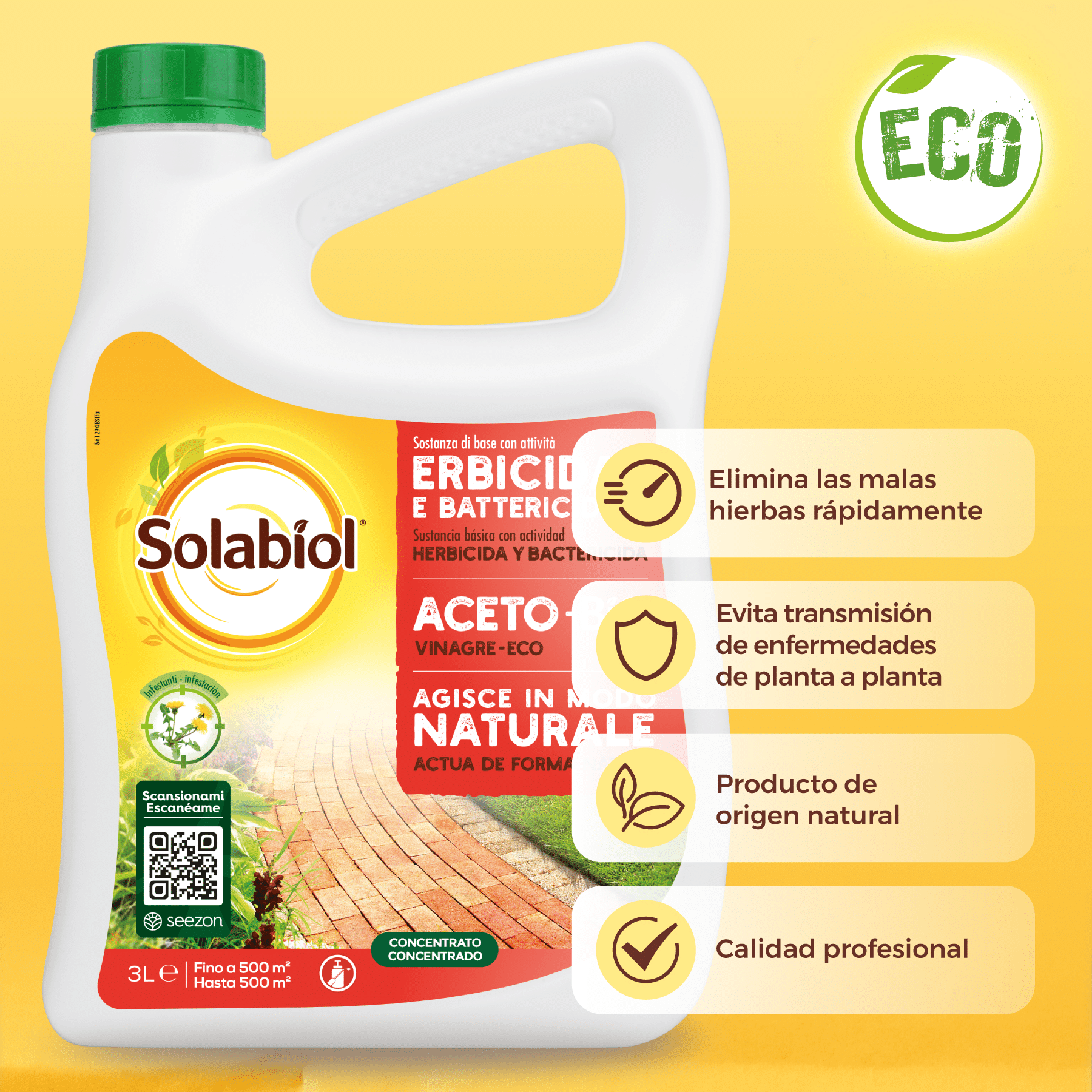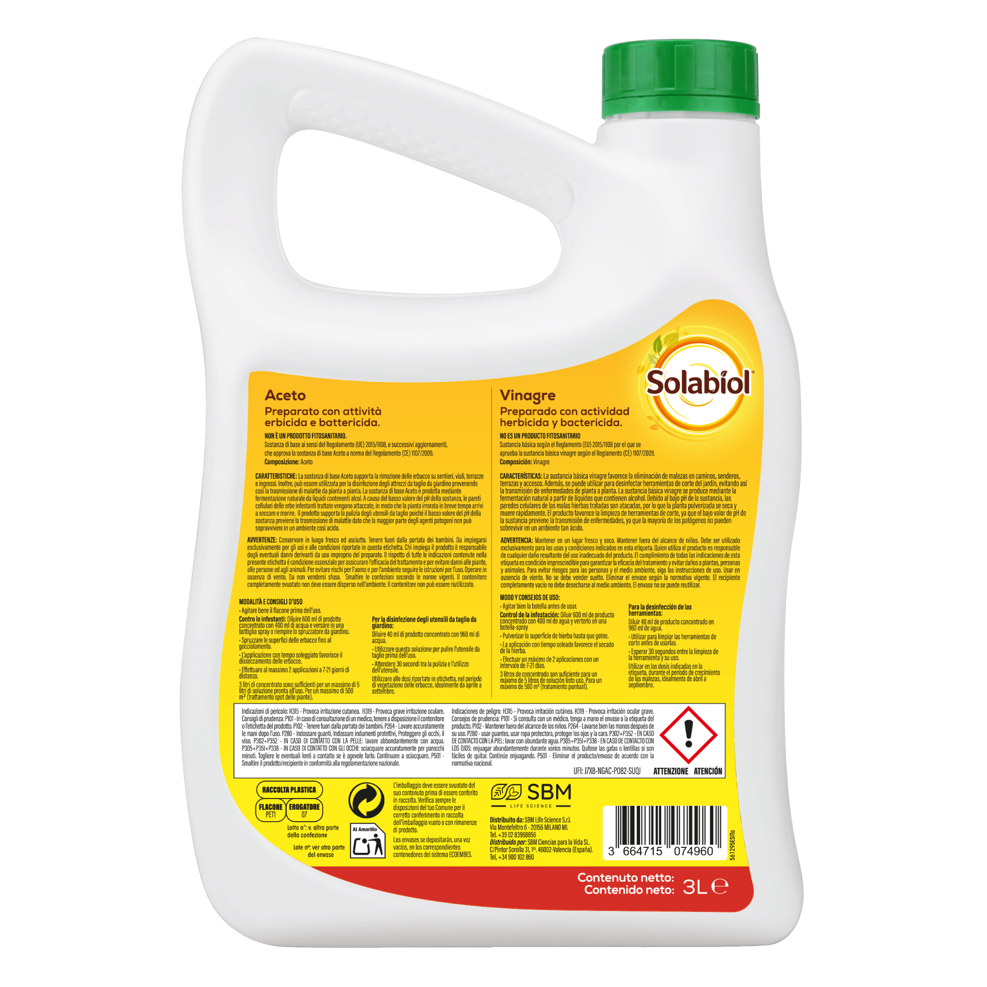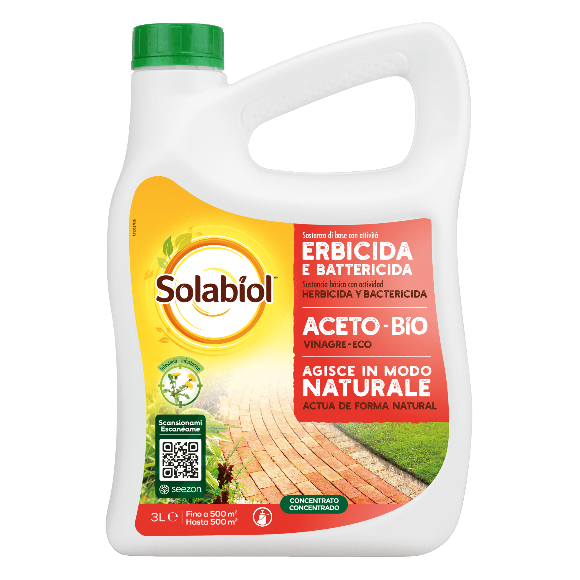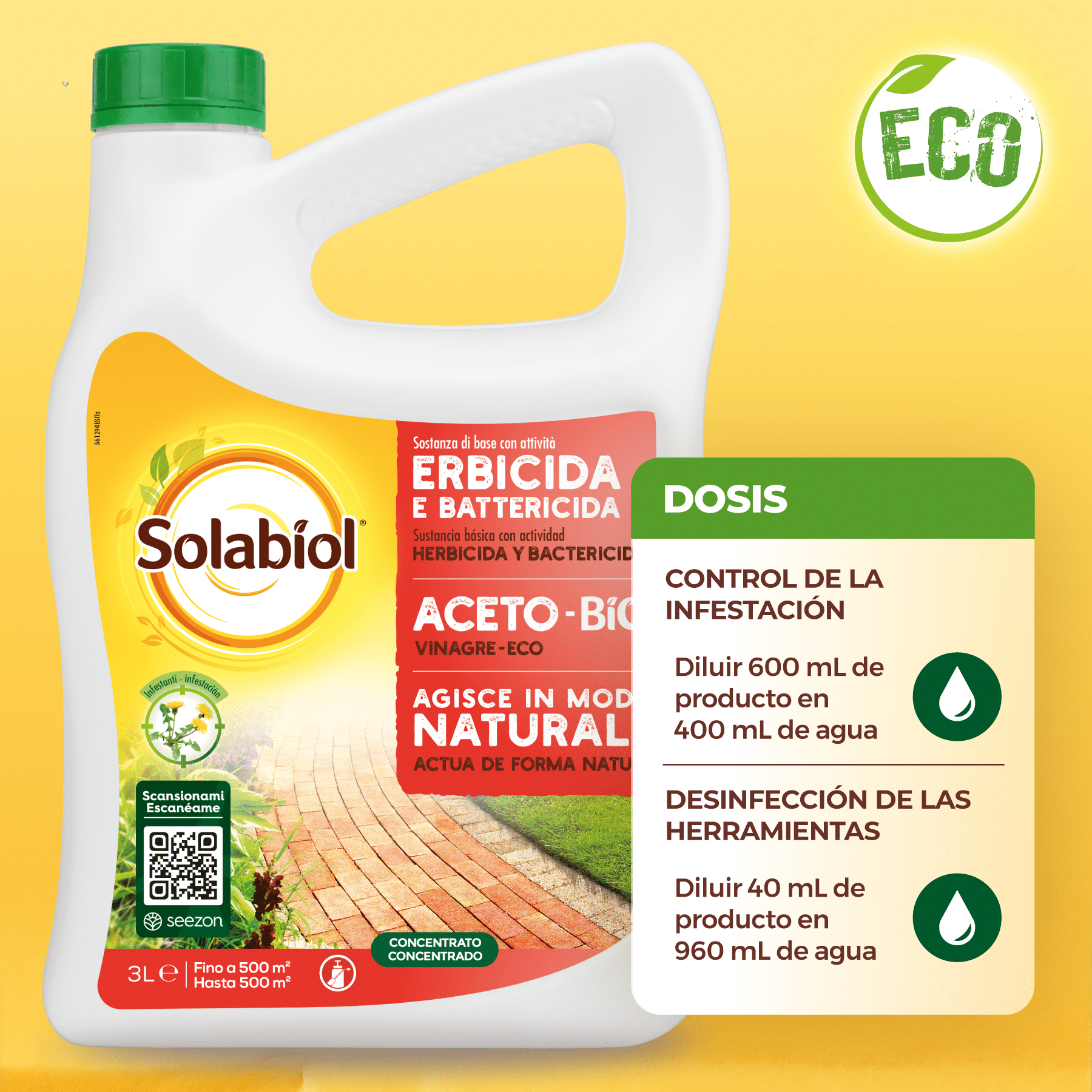 Vinagre Concentrado es una sustancia básica con actividad herbicida contra las malas hierbas en caminos, avenidas, terrazas y entradas. Gracias a la propiedad bactericida puede ser utilizado para la desinfección de las herramientas de corte de jardín previniendo la transmisión de enfermedades de planta a planta.